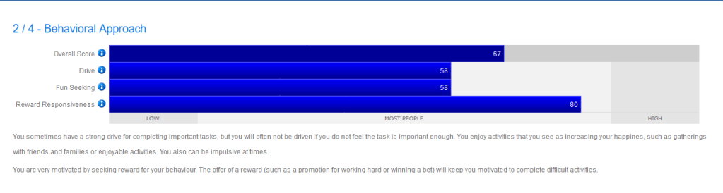 The third part of the test results is about Avoidance with my score being very high and the results telling me that my major motivation is to avoid things that I don’t like. Such as activities that cause me discomfort or pain it also goes on to say this can lead to me being a fairly nervous person, I would agree with these statements for the third part as I do regularly avoid or skip things that would provide me with discomfort or situations I would rather not be part of.